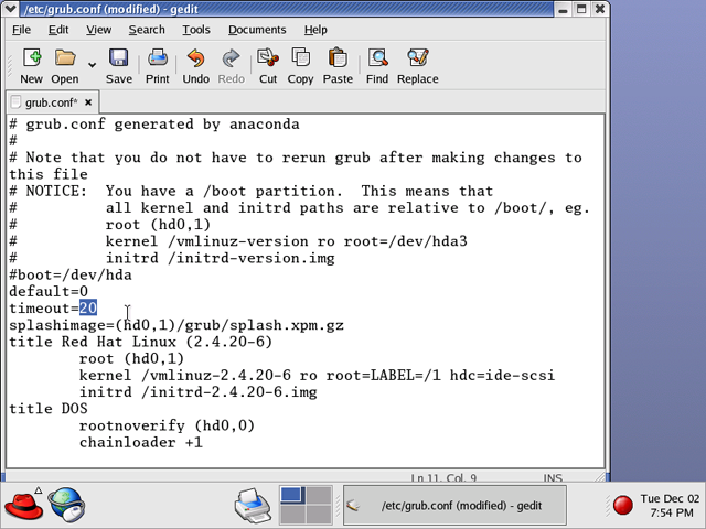 Figure 200: Changing the timeout value in grub.conf Timeout sets how long we have to select the OS to boot. After the timeout, if no other choice is made, the default OS is loaded.