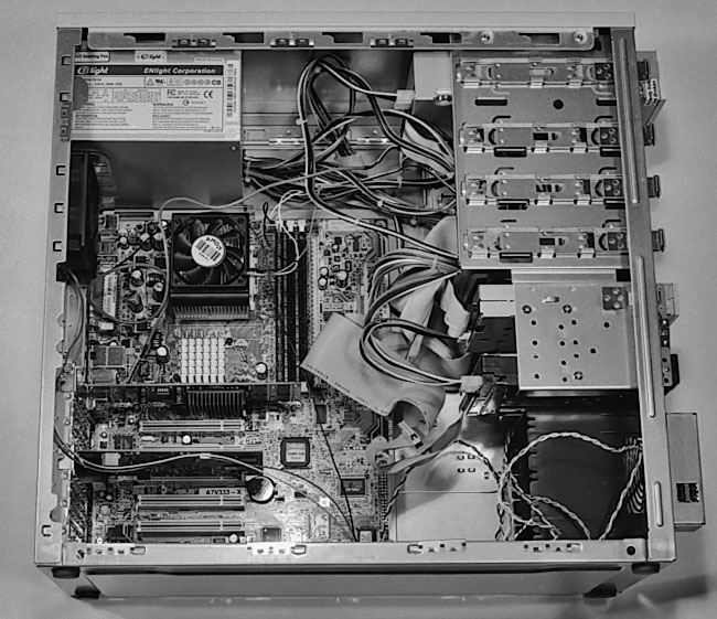Figure 126: The system is essentially built The mainboard has been installed. The drives have been installed, with ribbon cables and power cables connected. We’ve installed the AGP and PCI cards. Now, we test the system. Be sure the CPU fan is spinning before closing the side. You can run the system in any orientation. When closing the case, be sure no cables are pinched by the cover.