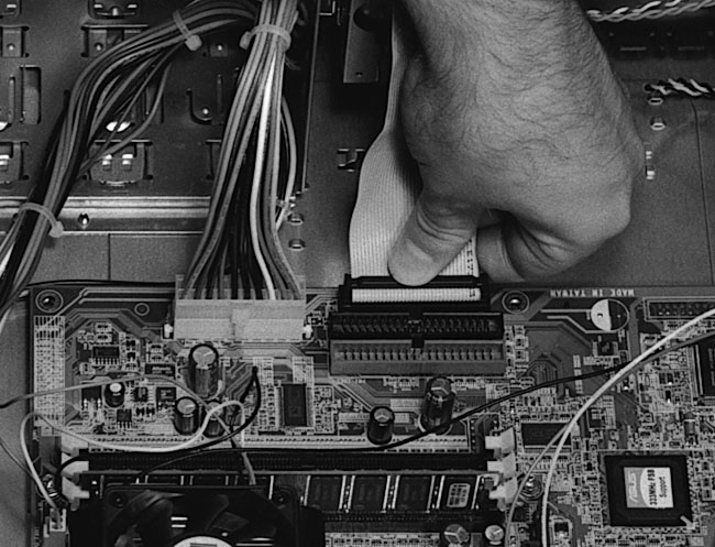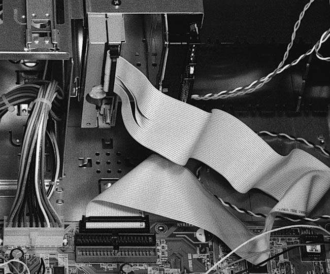 shows the floppy ribbon cable fully connected.