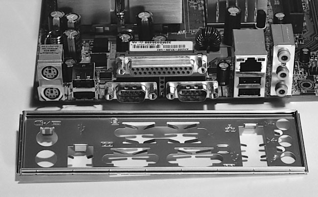 Figure 61: Orienting the I/O shield The corner of the mainboard must sit toward the top of the case (see Figure 58 to get an idea of where the mainboard sits). Thus, the new I/O shield must be installed so that the two big holes on the left (for the keyboard and mouse) are toward the top of the case. The three connectors to the right are for the mainboard’s built-in sound.