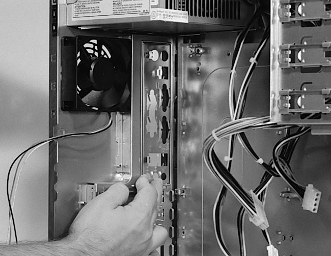 Figure 62: Popping the new I/O shield into place Note: The orientation of the shield is determined by the mainboard. The metal fins of the shield point inward. Writing on the shield to identify the connectors is on the outside.