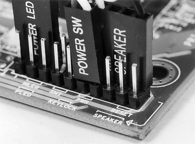 Figure 10: Thin-wire connectors connect the front of the PC case to the mainboard Even though these connectors can be plugged in backward, don’t fear, because doing so won’t harm your system. Try to get them onto the right pins on the mainboard.
