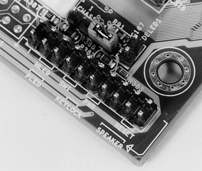 Figure 11: Corner of the mainboard The thin-wire connectors from the case will connect here. It’s easy to plug them in wrong.