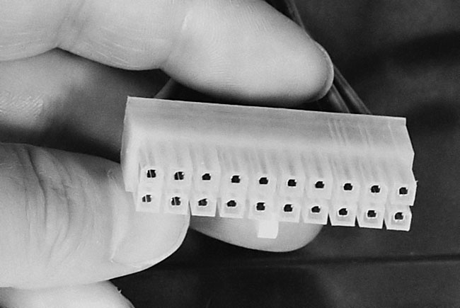 Most important power connectors, such as the twenty-pin ATX power connection, are designed so that they can only be plugged in one way. This prevents plugging the connector in the wrong way and causing damage to components by putting too high a voltage on a pin that isn’t designed to take it.