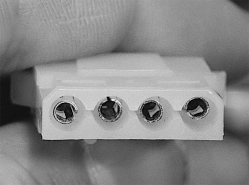 Figure 108: Four-pin Molex power connector These connectors provide power to most drives, including 3.5” hard drives, CD-RW drives, DVD drives, etc. One end has rounded corners so that it can only plug in in one direction. Sometimes, it takes a bit of force or wiggling them about to plug them in or remove them.