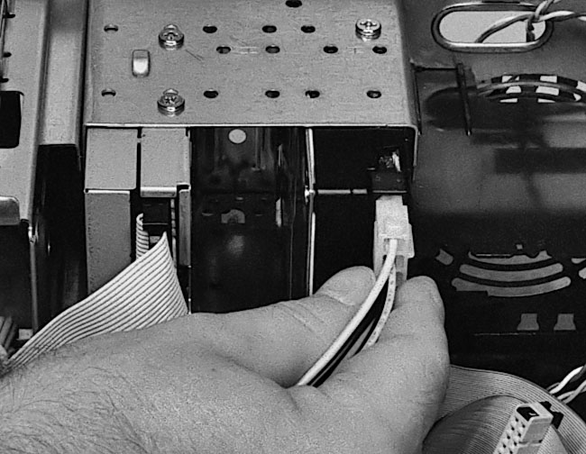 Figure 109: Plugging in a molex power connector to hard drive Case sits on its side.