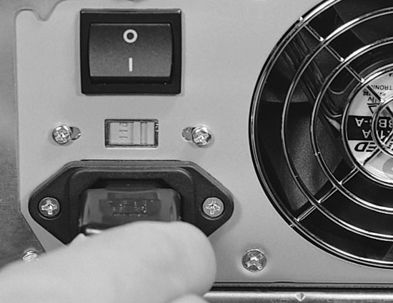 Figure 127: Plugging in the power cord to the back of the case Above it is the ATX power supply on-off switch. Between the cord plug-in and the power switch is a selector for setting the incoming voltage. For the U.S., it should already be set to 115 volts when purchased.