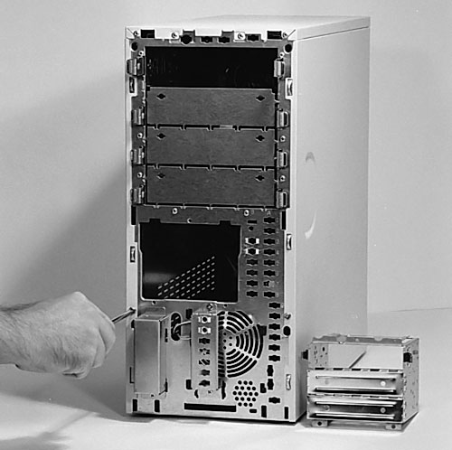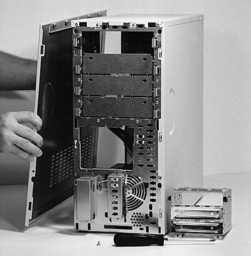 Figure 53: Removing the side panel of the case It’s held in by a single screw. You generally remove the side oppose the I/O shield which we discuss next. Pull the side slightly forward to remove it. Your case may disassemble differently.