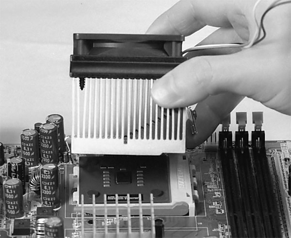 Figure 33: Heatsink sitting on CPU Notice the notch in the heatsink at the left, which fits the raised portion of the CPU socket.