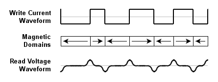 Therefore, in order to encode data on the hard disk so that we'll be able to read it back reliably, we need to take the issues above into account. We must encode using flux reversals, not absolute fields. We must keep the number of consecutive fields of same polarity to a minimum. And to keep track of which bit is where, some sort of clock synchronization must be added to the encoding sequence. Considering the highway example above, this is somewhat analogous to adding markers or milestones along the road.
