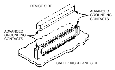 The physical SCA connectors also incorporate physical features to make hot plugging of drives easier. SCA drives slide into drive bays and mate with the system connector in the back without the user being able to see what is going on; this is called blind connector mating. To ensure that the connectors line up properly, special guides are provided on the host connector. There is also an LVD version of the SCA interface, which is now taking over from the single-ended type of SCA, as all new hard disks use LVD. The difference between LVD SCA and SE SCA is the same as the difference between LVD wide cable signals and SE wide cable signals: there are two changes. The first is that all of the signal returns are replaced with positive complement signals; for example, contact #58 on an LVD SCA connector is "+BSY", and so on. The second is that one ground is replaced by the DIFFSENS signal, in this case contact #46.
