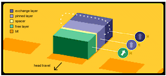 Here's how the GMR head works in a nutshell (without getting into quantum physics that would make your brain melt--and mine. :^) ) When the head passes over a magnetic field of one polarity (say, a "0" on the disk), the free layer has its electrons turn to be aligned with those of the pinned layer; this creates a lower resistance in the entire head structure. When the head passes over a magnetic field of the opposite polarity ("1"), the electrons in the free layer rotate so that they are not aligned with those of the pinned layer. This causes an increase in the resistance of the overall structure. The resistance changes are caused by changes to the spin characteristics of electrons in the free layer, and for this reason, IBM has named these structures spin valves. If you imagine a plumbing pipe with a rotatable shut-off valve, that's the general concept behind the name.