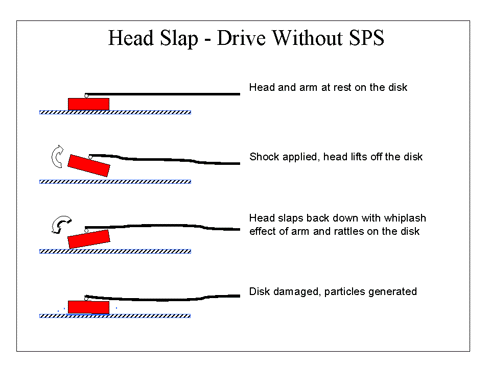[ The PC Guide | Systems and Components Reference Guide | Hard Disk Drives | Hard Disk Performance, Quality and Reliability | Hard Disk Quality and Reliability | Hard Disk Quality and Reliability Features ] Enhanced Shock Protection Several major types of drive failures can be caused by excessive shock applied to the drive, especially when it is in operation. This is not surprising, considering the way hard disks work. When you have very precise read/write heads floating a millionth of an inch above the surface of a smooth platter spinning thousands of revolutions per minute, you shouldn't expect that you can give the device rough handling without consequences! When the heads contact the surface of the platters, this is called a head slap and each such event carries the potential for damage or data loss. Despite the fragility of hard disk technology, we do expect to be able to treat them, well, if not roughly, then at least without kid gloves. We want to put hard disks into laptop computers and carry them around, or use removable drive trays, or incorporate tiny hard disks into devices ranging from handheld PCs to digital cameras. And even with desktop machines, we certainly don't expect the drive to fail if we bump into the case while the PC is on, or similar minor mishaps occur. To address the increased needs for portability, and to improve reliability and reduce sensitivity to shocks in a general way, hard disk manufacturers have been hard at work improving the shock resistance of drives. One great way to do this would be to basically pack cushioning material around the drive; unfortunately, this would create other problems, ranging from needing to enlarge the drive's form factor, to making cooling more difficult. Therefore, shock protection is primarily done by increasing the rigidity of the most important components in the drive, such as the actuator assembly and spindle motor. To reduce head slap in particular, the head arms are made stronger. Structural support and some cushioning for the disk-head assembly is also provided to help reduce the transmission of shock energy from the outside of the drive to the platters and heads, where damage could occur.