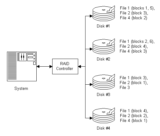 [ The PC Guide | Systems and Components Reference Guide | Hard Disk Drives | Hard Disk Performance, Quality and Reliability | Redundant Arrays of Inexpensive Disks (RAID) | RAID Concepts and Issues | General RAID Concepts ] Striping The main performance-limiting issues with disk storage relate to the slow mechanical components that are used for positioning and transferring data. Since a RAID array has many drives in it, an opportunity presents itself to improve performance by using the hardware in all these drives in parallel. For example, if we need to read a large file, instead of pulling it all from a single hard disk, it is much faster to chop it up into pieces, store some of the pieces on each of the drives in an array, and then use all the disks to read back the file when needed. This technique is called striping, after the pattern that might be visible if you could see these "chopped up pieces" on the various drives with a different color used for each file. It is similar in concept to the memory performance-enhancing technique called interleaving. Striping can be done at the byte level, or in blocks. Byte-level striping means that the file is broken into "byte-sized pieces" (hee hee, sorry about that, I just couldn't resist. ;^) ) The first byte of the file is sent to the first drive, then the second to the second drive, and so on. (See the discussion of RAID level 3 for more on byte-level striping.) Sometimes byte-level striping is done as a sector of 512 bytes. Block-level striping means that each file is split into blocks of a certain size and those are distributed to the various drives. The size of the blocks used is also called the stripe size (or block size, or several other names), and can be selected from a variety of choices when the array is set up; see here for more details.