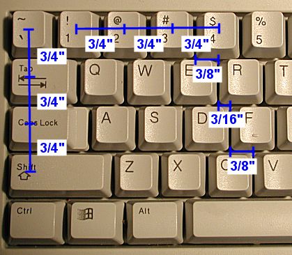 Again, we are discussing the regular alphanumeric keys here; the size, spacing and location of the keys other than the main alphanumerics varies greatly from one keyboard to another. These are discussed in the description of keyboard layouts. Also, special keys such as the <Enter> key and <Space Bar> are often of different sizes and spacing can be very different between models.