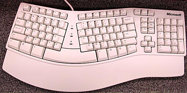 [ The PC Guide | Systems and Components Reference Guide | Keyboards | Keyboard Layouts | Non-Standard Keyboard Layouts ] Ergonomic ("Natural") Keyboards Assuming you are currently in front of your computer as you read this, and you are using a regular keyboard, conduct this quick demonstration. Sit comfortably in your chair, and rest your hands flat on your keyboard in the position where they would normally be during typing. Now look at the angle between your index fingers and the <Space Bar>. You'll probably find that it is somewhere between 30 and 60 degrees. This shows that in fact, the hands do not properly align themselves to the rows of keys in a regular keyboard. Most typists twist their hands slightly as they type to align their fingers to the keys, without even realizing it. You may even be able notice this shifting or twisting motion change as your hands move during typing. With keyboard use being implicated in the rise of repetitive stress injuries associated with the hand, such as carpal tunnel syndrome, some designers sought to possibly alleviate the problems--and make typing more comfortable at the same time--by adjusting the keyboard to the shape of the hands. The result is the family of keyboards that are usually called either ergonomic, or thanks to Microsoft's name for its version, natural keyboards. The fundamental layout change of these keyboards addresses the angle issue I just illustrated with my demonstration. The main typing area is in fact split into two parts, angled outward from the center of the keyboard. This allows the left and right hands to rest more naturally, with the fingers properly aligned to the keyboard rows. These keyboards are usually contoured, and many include integral wrist rests and other ergonomic features.
