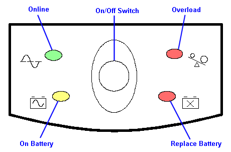 Diagram of the status LEDs of a consumer-grade APC UPS,