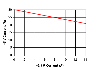 For the ATX/NLX, SFX and WTX form factors, which provide +3.3 V power (as well as +5 V Standby power and potentially others), there is an added complication: there is a maximum rating for each of the +3.3 V and +5 V currents, but also a combined "+3.3 V / +5 V" rating. The power supply will provide up to the combined total on these two voltages, in any combination as long as the individual current ratings are not exceeded. Here's a sample (actual) 300 W ATX form factor power supply's distribution: